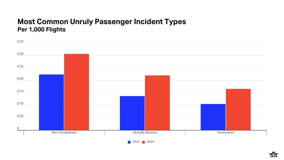 Latest figures show that there was one unruly incident reported for every 568 flights in 2022, up from one per 835 flights in 2021. The most common categorizations of incidents in 2022 were non-compliance, verbal abuse and intoxication. Physical abuse incidents remain very rare, but these had an alarming increase of 61% over 2021, occurring once every 17,200 flights.